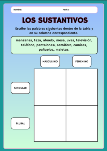 Este recurso propone actividades simples para que los estudiantes identifiquen y clasifiquen sustantivos según su género y número. A través de imágenes y palabras, los niños pueden reconocer si un sustantivo es masculino o femenino, singular o plural, reforzando conceptos básicos de gramática de forma visual y práctica.