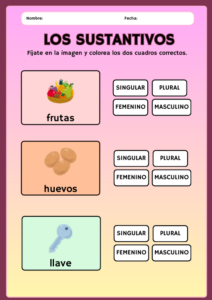 Este recurso propone actividades simples para que los estudiantes identifiquen y clasifiquen sustantivos según su género y número. A través de imágenes y palabras, los niños pueden reconocer si un sustantivo es masculino o femenino, singular o plural, reforzando conceptos básicos de gramática de forma visual y práctica.